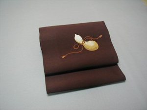 濃い少し赤みがかった地色にひょうたんが1つ踊っているような模様です。ワンポイント的なあしらいになっておりますので、紬などのおしゃれ着物に最適です。この商品は爪掻本つづれ帯です。図案どうりに色糸を1本づつ掻きよせて織っていますので、たいへんな手間がかかっております。